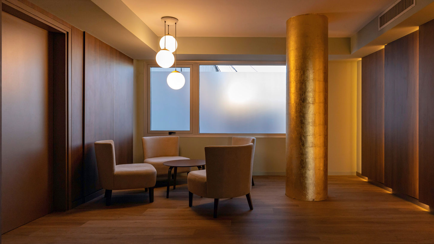 Este edificio al cual le hicimos los amenities y las áreas públicas como halles y pasillos está pensado para abogados y profesionales de la justicia por su proximidad a los tribunales. Por eso tiene que tener aplomo pero a la vez tener un cierta prestancia que tienen los abogados. El hall así lo muestras con su doble altura con una cúpula dorada a la hoja con una lámpara que cae como una catarata de luz. Sus paredes en madera recrean un bosque que se refleja en el espejo sobredimensionado de la pared de enfrente. Los amenities del último piso a pedido del cliente recuerdan a un club inglés, lo creamos con los colores y elementos clásicos del interiorismo inglés , con una elegancia sin tiempo.
